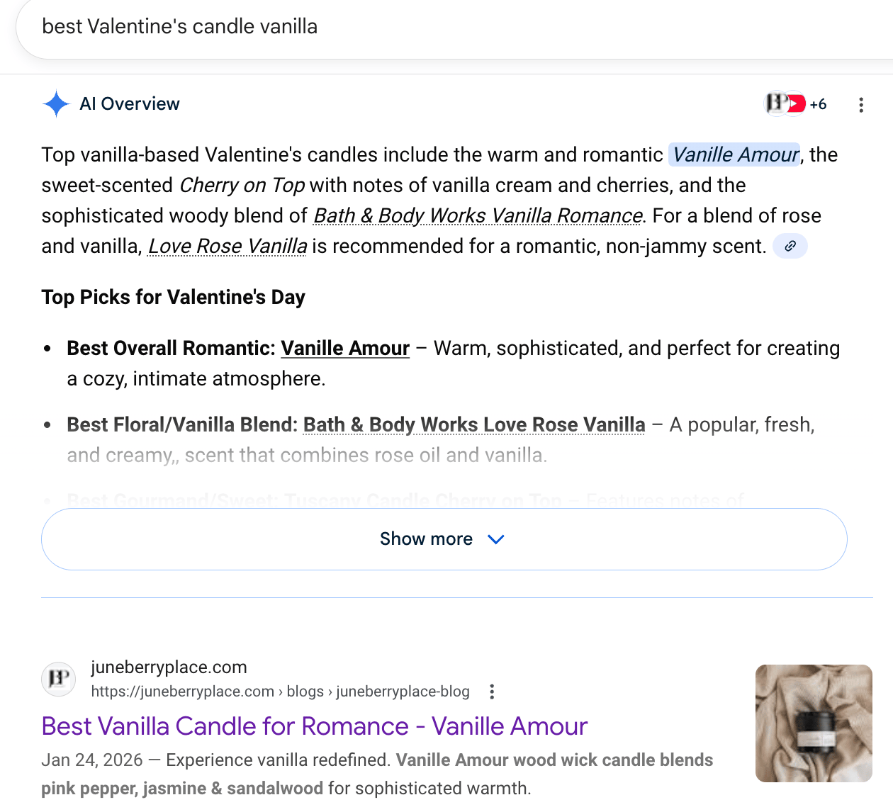 So, less than a week after publishing, that post is getting recommend FIRST in the AI-overview AND it's showing up in position #1 on Google for "best Valentine's candle vanilla"
