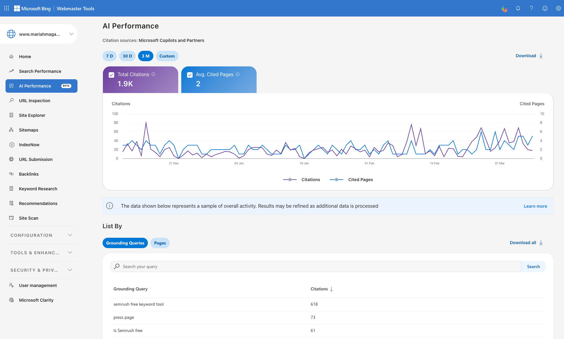 Here's a screenshot of my personal AI data in Bing Webmasters π